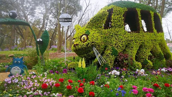 在该园花艺馆南侧,有一辆绿植做成的“龙猫巴士”,在其周围,藏着好几只憨态可掬的龙猫,有的坐在倒伏的树枝上,有的躺卧在草丛里睡大觉,有的打伞等候在车站;许多“灰尘精灵”也散布在场景中,和龙猫做伴。