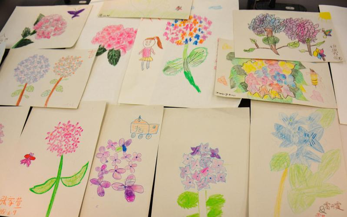 孩子们经过对八仙花酸碱度的试验,把想象中的八仙花花园画了下来