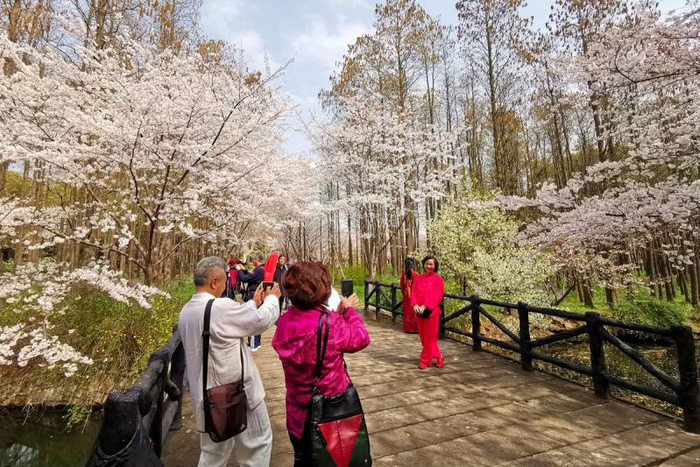 记者从共青森林公园获悉,近期开得最盛的是桃花、樱花、海棠。该园内现有海棠10余个品种共1200多株,桃花10余个品种共1000多株,樱花6个品种约400株,呈现一派“翠林映花海,红景绣春堤”的风光。