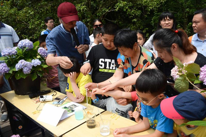 八仙花的萼片受土壤酸碱度影响,会呈现不同色彩,土壤呈酸性,花色就偏蓝;呈碱性,花色就偏红。于是,园方把八仙花的颜色交给市民游客拿主意,邀请他们参与土壤酸碱度的调试,把脑海中的八仙花花园化为了现实。