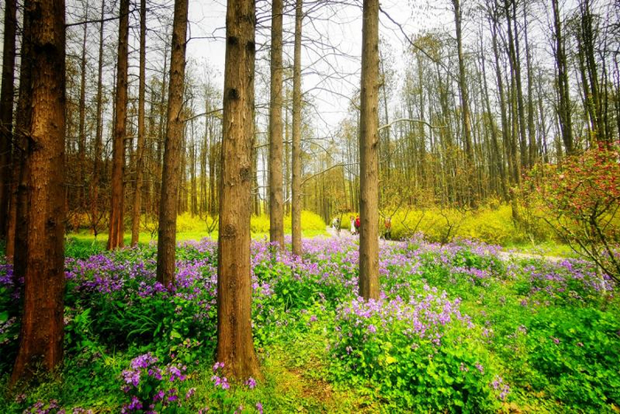春季也是野花野草生长旺盛的季节。目前,30多种野花已在林下空间渐次绽放,如蓝色系的阿拉伯婆婆纳、活血丹;紫色系的刻叶紫堇、夏天无、紫花地丁、二月兰;黄色系的黄鹌菜、毛茛、蒲公英;白色系的繁缕、天葵、荠菜、碎米荠,还有红色系的泥胡菜、宝盖草、救荒野豌豆,与主力花卉相映成趣。