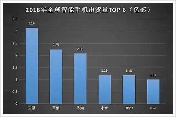 2018年,三星在全球智能手机市场份额中占比19%,连续7年位居第一;排名第二的苹果占比13.4%,华为13%,小米7.9%。