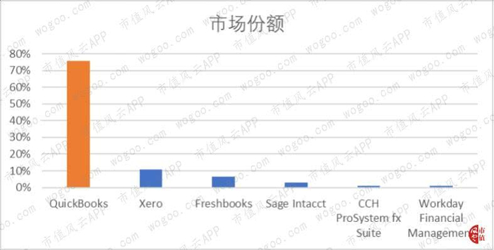 根据Datanyze统计的2019年2月美国在线财务软件使用数据,QuickBooks Online拥有76%的市场份额,大幅领先竞争对手。