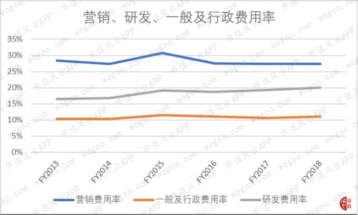 公司的研发费用率由2013财年的16%,逐渐提升至2018财年的20%,公司支出向研发方向有所倾斜。