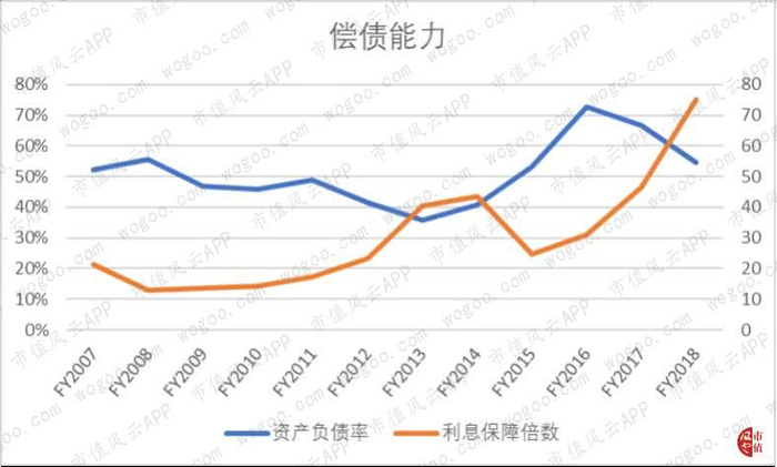 2018财年,公司资产负债率仅为54%,利息保障倍数则达到了75倍。