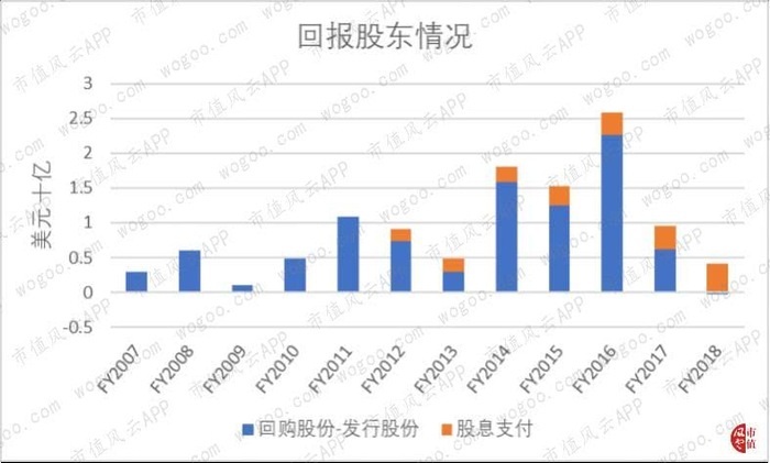 从2012财年开始,公司开始每年分红,且逐年提高。2018财年支付股息4.1亿美元。股息占归母净利润的比例从2012财年的23%提升至2018财年的34%。