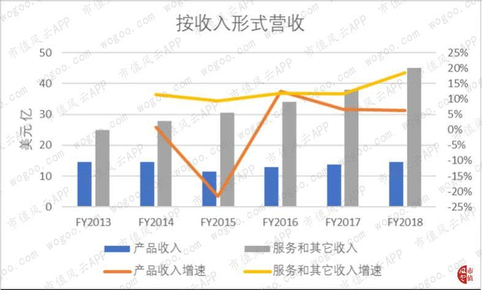 2014-19财年,产品收入CAGR为0%,基本没有增长。服务收入CAGR为12%,其中2018财年增速为18%。服务收入增速逐渐提高。