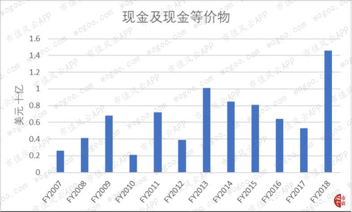 同时公司的现金及现金等价物也大幅上升,2018财年达到了14.6亿美元。