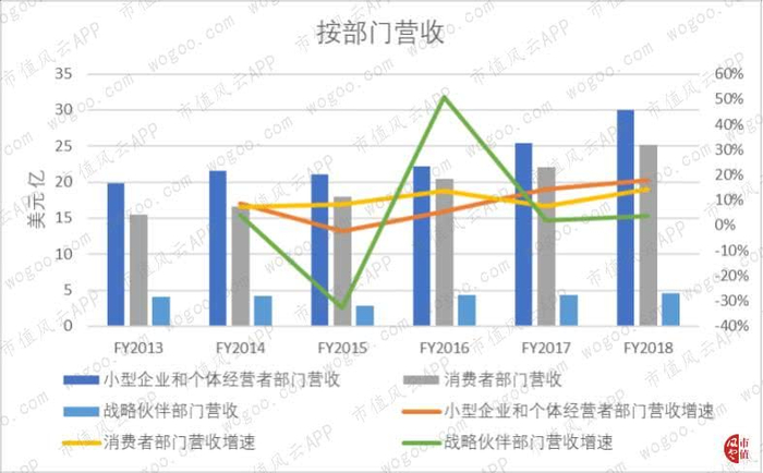 公司的业务按客户群体分为三部分:小型企业和个体经营者业务(Small Business & Self-Employed)、消费者业务(Consumer)和战略伙伴业务(Strategic Partner)。