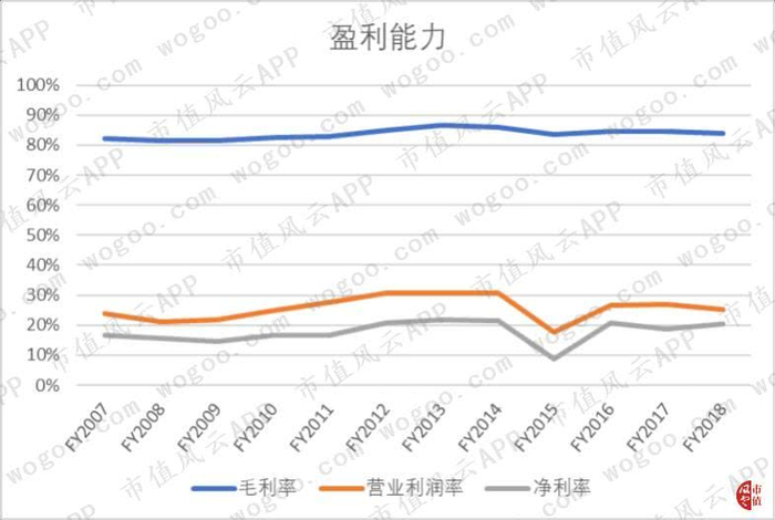 2007财年以来,公司毛利率一直维持在80%以上的高水平,且比较稳定。营业利润率和净利率在2015财年的短暂波动之后,重回稳定区间。