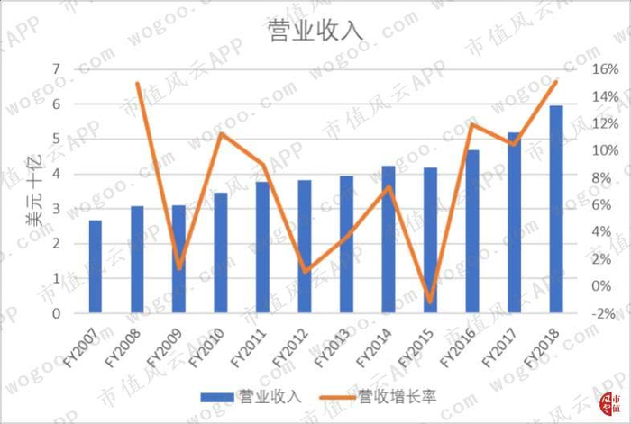 从2007财年以来,财捷营收增速从趋势上看先降后升。2018财年营收为59.6亿美元,同比增长15%,创2008财年以来新高。