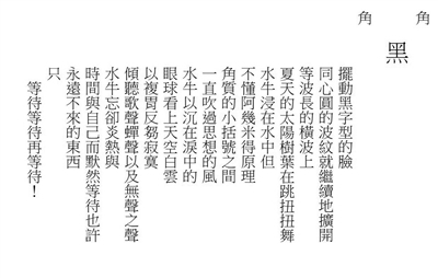 图像诗又称视觉诗、具象诗,是一种把词语、诗行按某一图案或形状排列而成的诗。除了在文字上做功夫,图像诗还可以操纵图像空间,改变我们原有的阅读习惯。