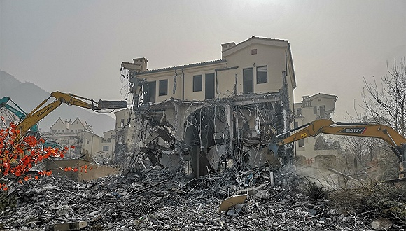2019年2月21日,石家庄市委市政府牵头的联合调查组组织力量拆除西美金山湖别墅区违法建筑。摄影:翟星理