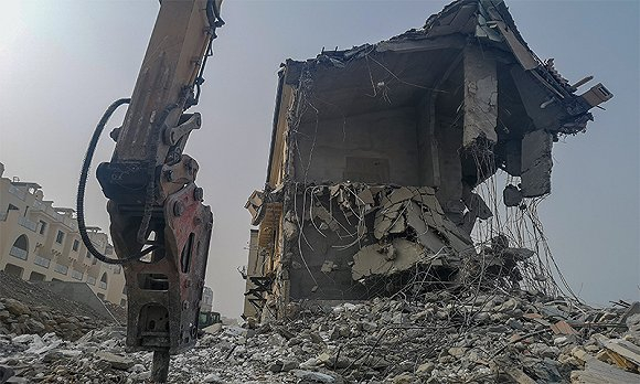 西美金山湖别墅区拆违现场,礼堂倒塌扬起的烟尘。摄影:翟星理