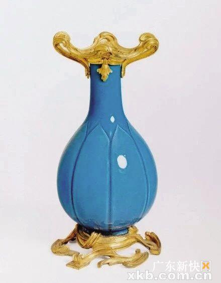 ■清乾隆 孔雀蓝釉瓶 镶法国鎏金铜边 玫茵堂藏