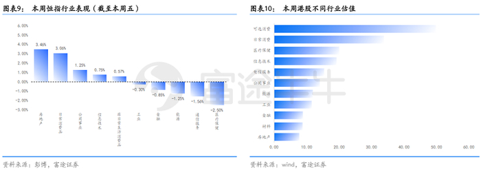 港股行业方面,涨幅前三的行业分别为房地产、日常消费品和公用事业,各录得3.46%、3.06%、1.25%的涨幅。此外,估值方面,可选消费板块位列榜首,其次才是日常消费和医疗保健。