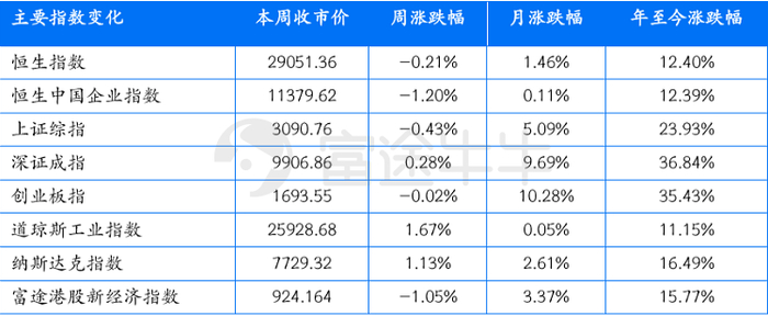 A股方面,本周,A股整体持平,上证指数跌0.43%,收报3090.76 点;深证成指涨0.28%,收报9906.86点;创业板指跌0.02%,收报1693.55点。