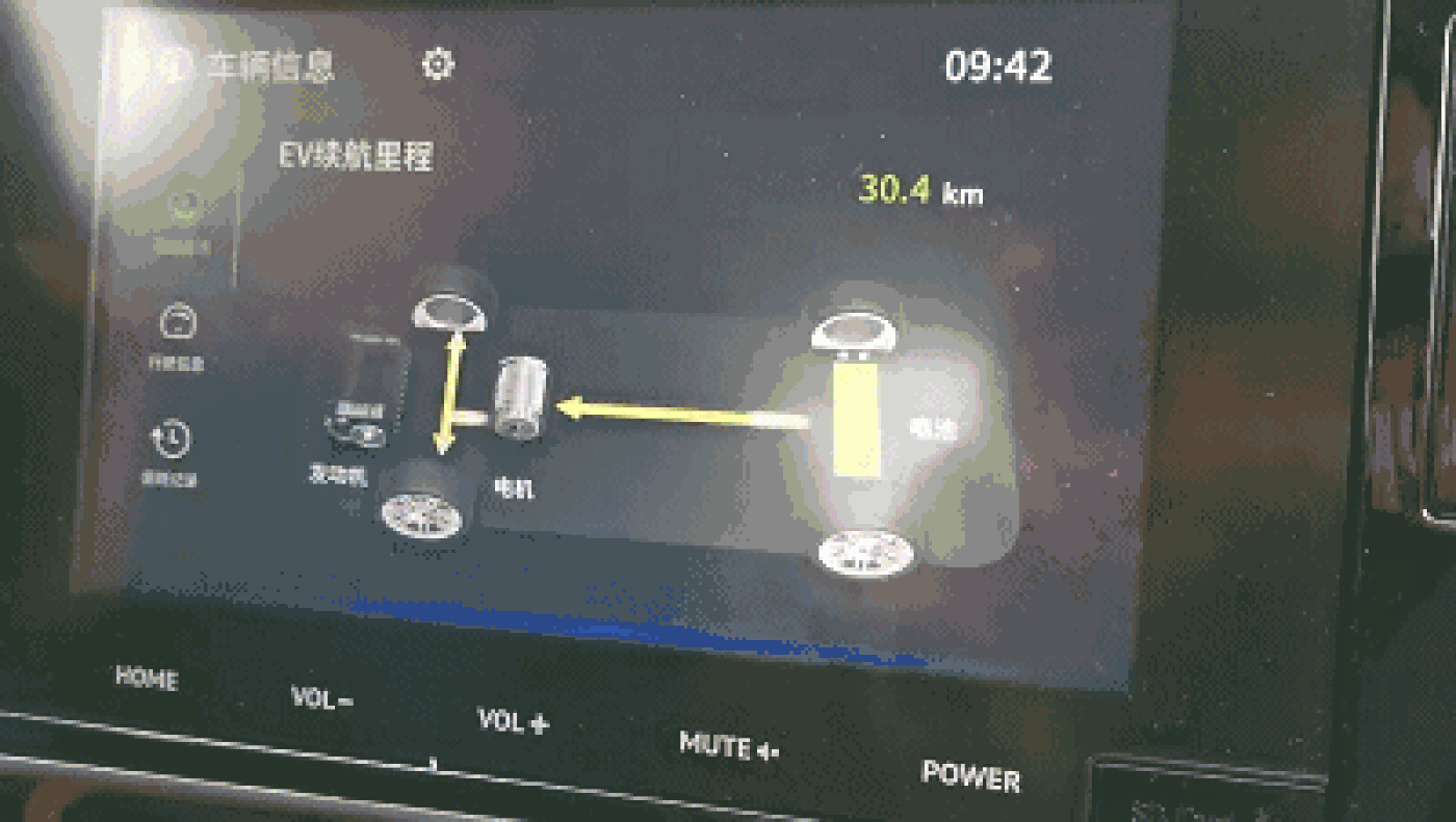 在以上模式切换中,可以在中控屏上进入车辆配置界面,实时查看动力组成情况,通过动画可以实时的看到燃油发动机,电动机,蓄电池之间的动力输出入和做功的关系。