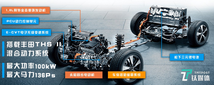 高科技配置和动态试驾这次试驾车采用的是丰田成熟的THS II混合动力系统。一台1.8升阿特金森循环发动机和一台最大输出53千瓦的永磁同步电机,最大功率总计100KW,136马力,采用ECVT变速箱,发动机和变速箱之间用星形齿轮咬合,动力效率更高。