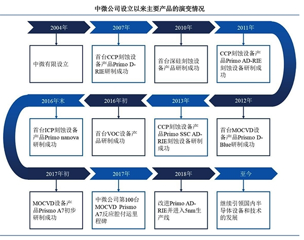 中微半导体主要从事高端半导体设备的研发、生产和销售。自成立以来,公司主要业务是开发加工微观器件的大型真空工艺设备,包括等离子体刻蚀设备和薄膜沉积设备。等离子体刻蚀设备、薄膜沉积设备与光刻机是制造集成电路、LED 芯片等微观器件的最关键设备。