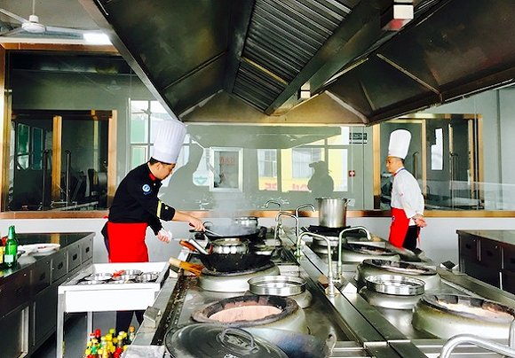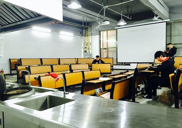 在锅碗瓢盆当中上毛概对于不熟悉的人来说,很容易把这所学校的教室当成食堂——里面满是炒锅和调味料。就连小型的阶梯教室讲台上,也会驾着一口大炒锅和其他灶台设备。过去2年里,喻大双和胡涛和他们2018届的学弟学妹们在这所阶梯教室里完成了毛概、英语与管理类等理论课程。