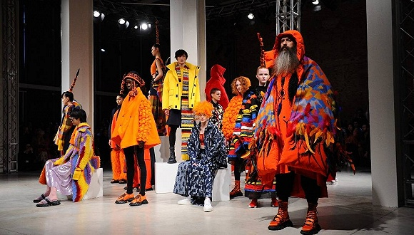 开场后,男女模特身着或红色,或橙色,或明黄,或藏青等高饱和色调的2019秋冬季服装,或在旋转梯上下,或在圆形秀场内部来回穿梭走动。是的,Angle Chen本季在设计上大胆借鉴西部阿坝藏区古老的羌族文化,以表达对游牧民族文化的敬佩和赞叹。