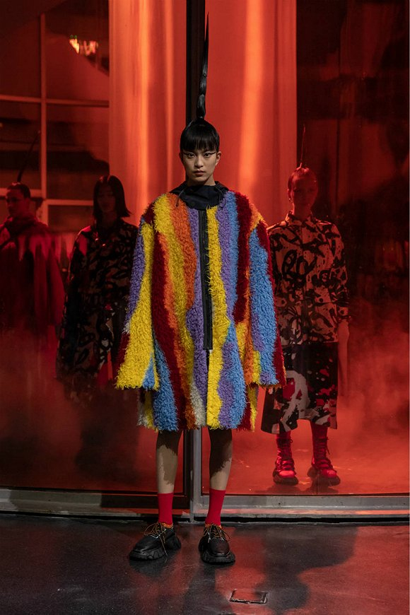 Angle Chen在本季服装的面料选择上也十分大胆多元。除了延续以往对羊毛料的使用,还首次采用了贴布流苏,将棉布进行针织和梭织。此外,设计师还选用了印度纯手工刺绣、多色格纹面料以及拼色不规则人造皮草卷毛提花。