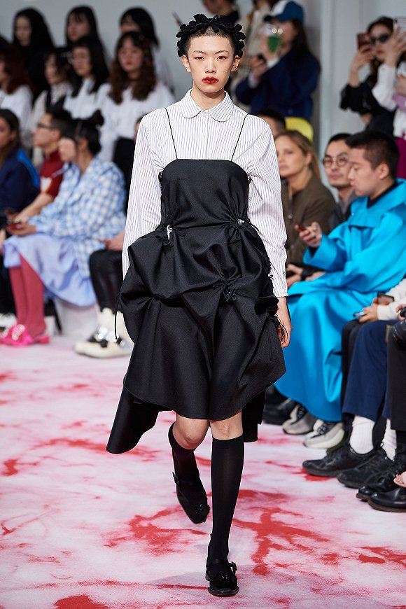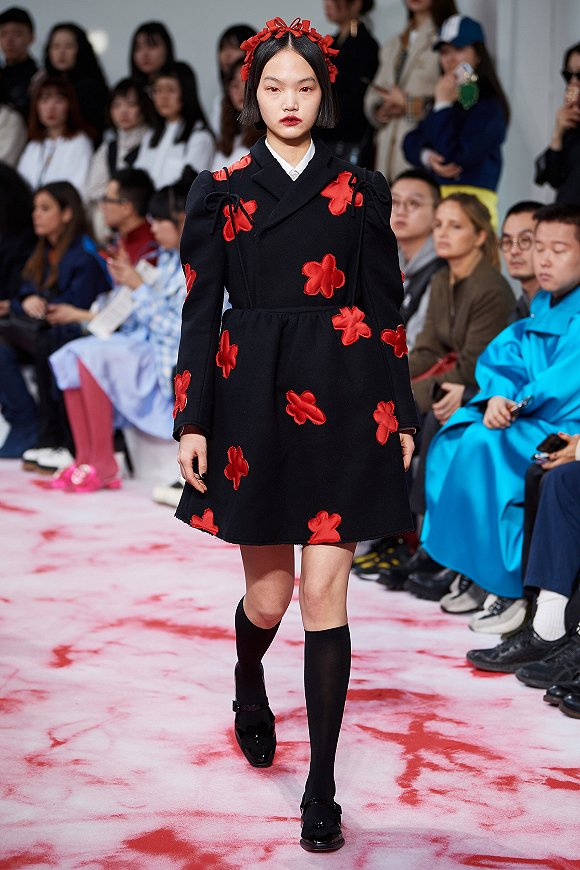 为了体现少女的纯真和邪恶的两种特征,SHUSHU/TONG在设计中运用对比的手法来体现两种感觉的混搭。主色调中不仅有黑红配色,也有天蓝与纯白。材质方面的对比则是硬挺漆皮和带着童真感的圆弧廓形。此外,2019秋冬延续了上一季的绗缝元素,配以丝绒面料和手工钉珠。同时,品牌的经典元素花朵图案,也以毛边拼布的形式组装在衣服上。
