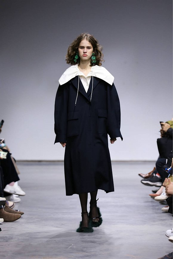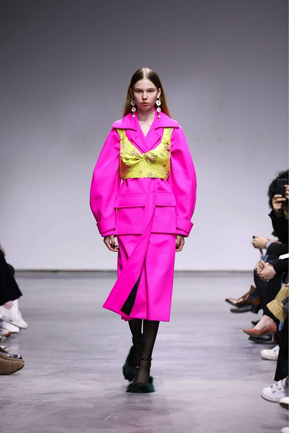 Ming Ma2019秋冬本季没有让我们失望。该系列在一个纯白色极简的长方形空间展开。作为观者,我唯一能做的是把双目聚焦在身着华服、面容各异的模特身上。本季的设计有一个非常鲜明的特点:强烈的复古1920年代女性着装风格与明快艳丽(粉红、明黄、藏青、鲜红等)的高饱和度色块相撞。