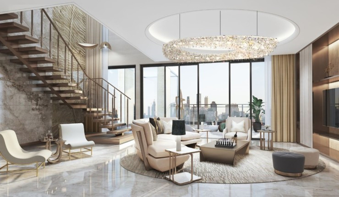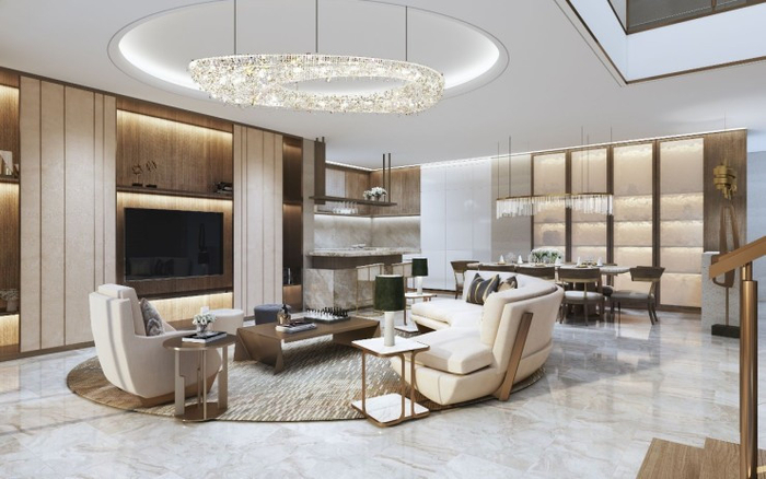 轩朗开阔的客厅,结合大自然沙、石、水等形态的设计元素,加上金光熠熠的天花板吊灯的点缀,整体呈现出宁静淡雅的场景。开放式厨房设计更体现了在阅尽世界繁华后全身心回归生活的生活理念。