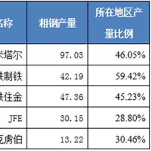 图表1 2017年世界主要钢铁企业的粗钢产量情况(单位百万吨、%)