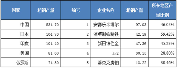 数据来源:Worldsteel Association,世界钢铁统计数据2018。注:安赛乐米塔尔按欧洲占比计算