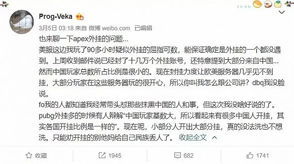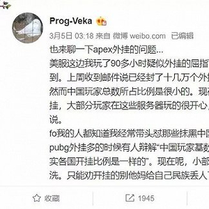 该游戏开发商Respawn公司的一名华人员工@Prog-Veka在微博上爆料,已经封禁了十几万个外挂账号,大部分来自中国。因此众多海外用户开始在各大论坛上呼吁,希望能够“封锁中国区玩家,避免该游戏被外挂毁掉”。
