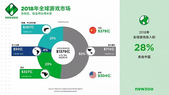 在国外数据分析公司Newzoo发布的2018全球游戏市场报告中,中国在这一年产生了379亿美元的收入,占据了全球的28%,稳坐全球游戏市场的头把交椅。