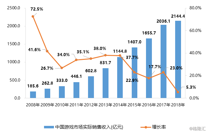 2018年是中国游戏行业的“小年”,受游戏版号限制、总量控制等相关政策影响,中国整体游戏市场增速放缓,2018年增速由前一年的23.0%下降至5.3%。国内游戏龙头公司,腾讯、网易、完美世界等游戏业务增速均跌至个位数。