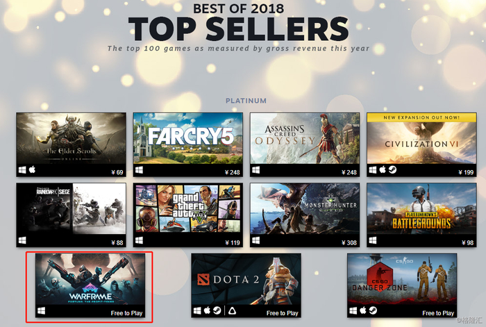 事后证明,乐游的这个战略也相当精准, Warframe不负众望,继勇夺二零一七年度Steam铂金级最畅销游戏(年度总收入最高的12款游戏) 和最高同时在线游戏(同时在线人数最高的6款游戏)之后,Warframe再一次在Steam平台上摘得二零一八年最佳游戏的这两个奖项,使Warframe成为唯一一款并非由Valve (Steam)开发的获此殊荣的免费网游。
