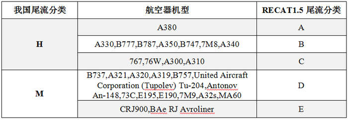 1)RECAT1.5尾流分类标准相较我国现行标准,将航空器的进近时速、机翼结构等因素例如考虑,对航空器的尾流分类进行了细化,将重型机(H)细分为A、B、C三类,中型机(L)细分为D、E两类。