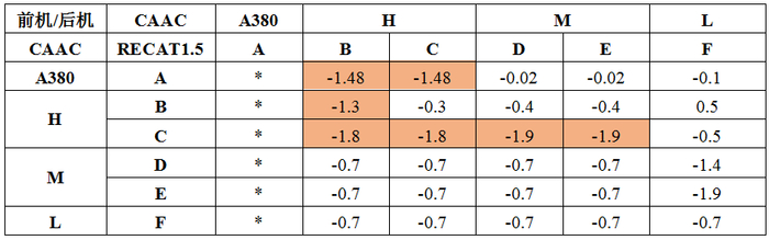 表2FAA最新RECAT1.5雷达尾流间隔最低标准(单位:nm)