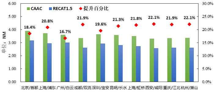 根据不同尾流分类标准的技术要求,计算得到我国前十大繁忙机场的加权平均尾流最小间隔值,并点绘于图3中。经比较,在理想情况下若其它影响跑道容量的条件与因素不发生变化时,RECAT1.5尾流间隔标准可以有效缩短机场的进近/离场的加权平均最小尾流间隔。其中,基于我国现行尾流分类标准的全国前十位机场的加权平均最小尾流间隔均值为3.52nm,基于RECAT1.5尾流分类标准的全国前十位机场的加权平均最小尾流间隔均值仅为2.79nm,较前者平均缩短了0.78nm。相比我国现行尾流标准,采用RECAT1.5标准在雷达进近/离场时,理论上可平均提升机场相对容量的20.7%。由此可以看出,RECAT1.5标准会在很大程度上增加现有机场跑道的运行效率与容量,提升机场应对更高运量、更多机型运行发展的适应性。