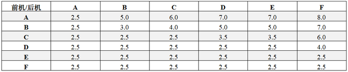 尾流再分类标准(RECAT)中既保留了原有的按航空器最大允许起飞全重分类的依据,并在此基础上将航空器的进近时速与机翼结构等因素列入考虑。在新的分类标准下,航空器被重新划分为A到F六个类别,并相应地调整了不同类别间的雷达间隔最低标准。根据FAA最新发布的航空器分类最小尾流间隔标准(RECAT1.5)[5],整理得到RECAT现行的最新雷达尾流间隔最低标准如下表2所示。