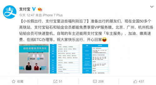 根据支付宝公布的数据显示,截止到现在,支付宝钻石和铂金会员可免费享受全国50个高铁站VIP服务,包括专属休息室、免费茶点饮料、Wi-Fi、手机充电、上车提醒等,还可以带1.2米以下的儿童同行。