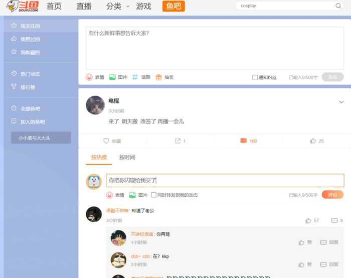 现阶段,斗鱼的鱼吧有点像微博+贴吧,此前的鱼吧在产品形态上更接近贴吧。