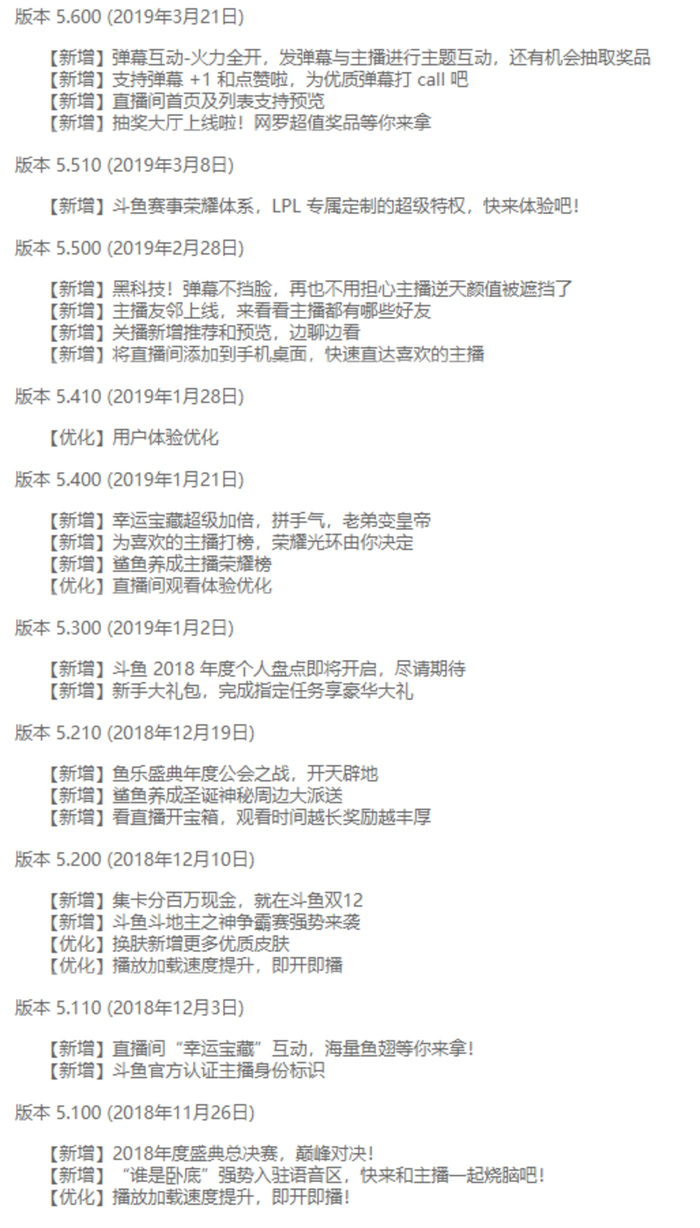 通过AppAnnie数据,我们能够看到,斗鱼APP的版本更迭速度快,步伐大。从2018年11月26日开始,到2019年3月21日,不到四个月时间,斗鱼更新了十个版本,几乎每次更新,斗鱼都会带来新增功能,无论是比邻,弹幕火力全开还是幸运宝藏超级加倍。斗鱼APP的每次版本更新中,新增的功能数量都远超优化的功能数量。
