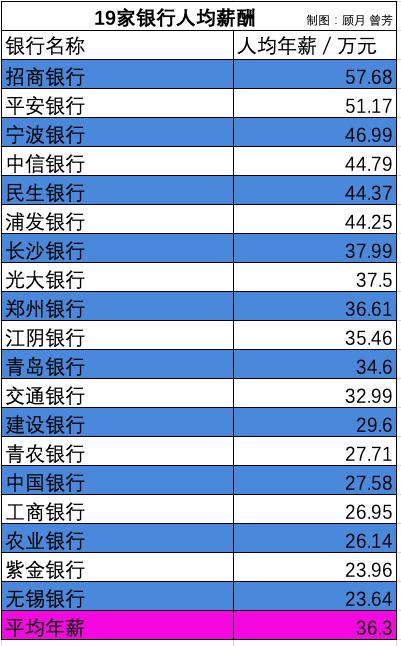 随着银行竞争压力和工作强度的加大,部分人士眼中的银行已经不再是金汤匙。但从已披露年报的19家A股上市银行中,依然可以发现银行的薪酬充满了竞争力。人均年薪酬高达36.3万元,远超出全国2.8万元平均水平,即使仅以北京2017年10.15万的人均工资来看,银行人均薪酬也是其3.5倍,银行业依旧属于超高薪行业。