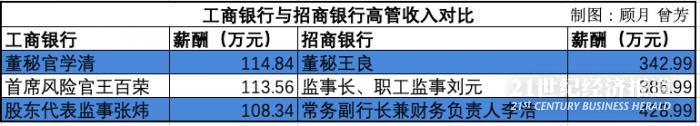 此外,在国有行,相比于董事长、行长等一把手职位,银行如董秘、首席财务官、熟悉风险官的薪酬反而更高。我们分别以“宇宙行”工商银行和股份行中资产规模最大的招商银行为例,看看高级管理人员的薪酬对比。