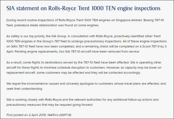 新加坡航空公司就波音787-10客机配备的罗罗Trent 1000 TEN发动机问题发布声明,截图来自新加坡航空公司官网