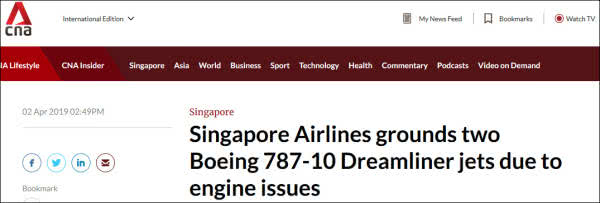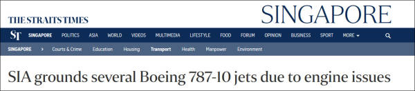 “由于发动机问题,新加坡航空公司停飞数架波音787客机”,截图来自新加坡海峡时报