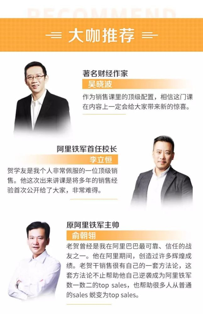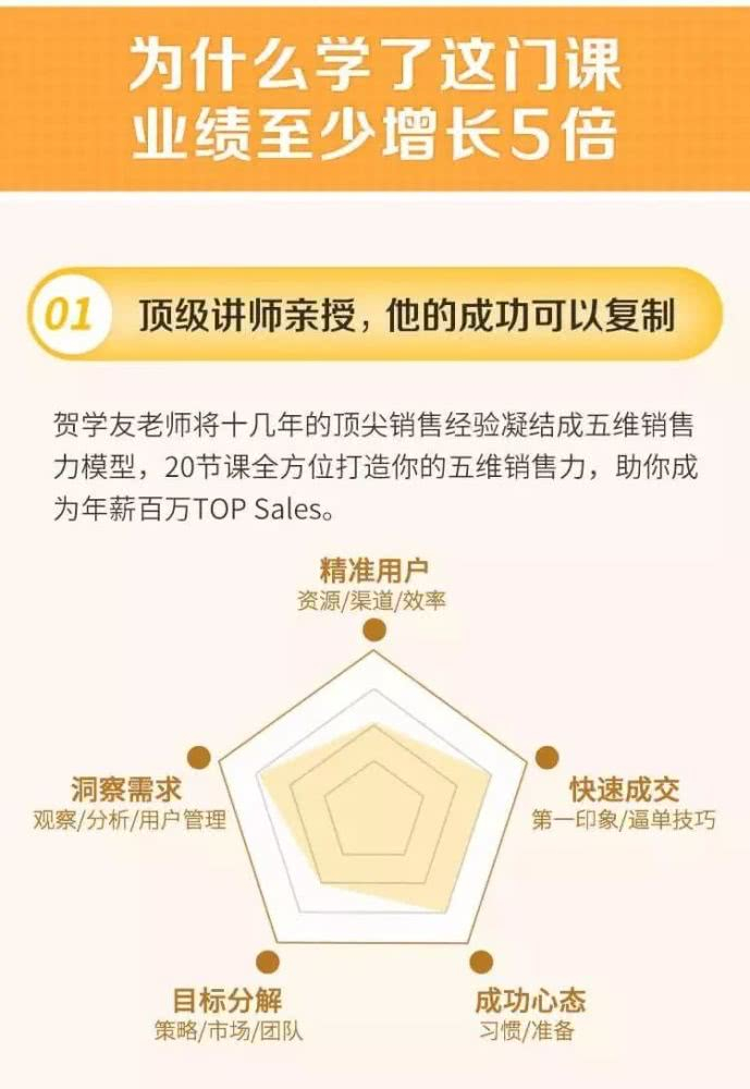 这一次的课程,易简学院联合贺学友首次向大众公开自己的销售方法。他花费一年时间,打造了《20节顶级销售实战课,带你业绩5倍暴涨》。