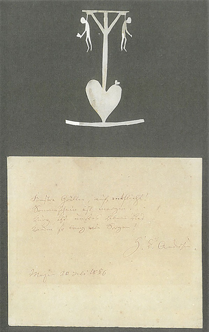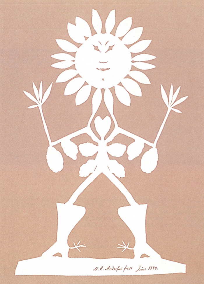 1848年安徒生在索榆英厄曼家剪成这幅作品送给时在索榆学院任教的植物学家朗厄,剪纸是植物学家的象征。