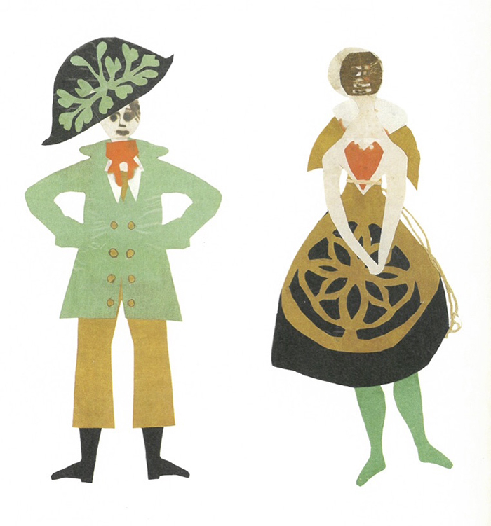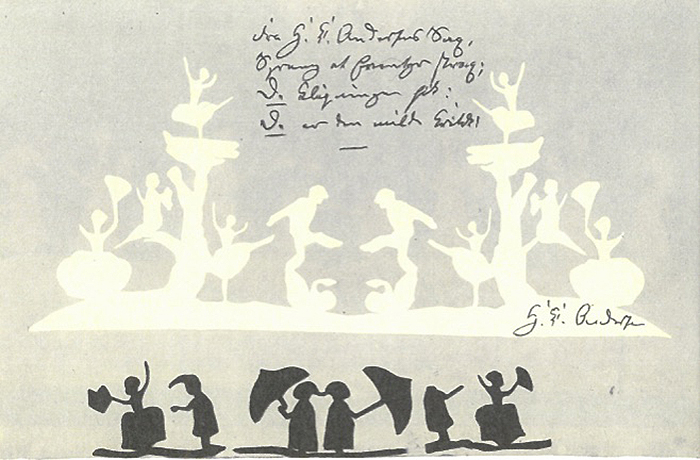 有舞蹈演员的舞台造型,剪纸上方是安徒生的手迹: